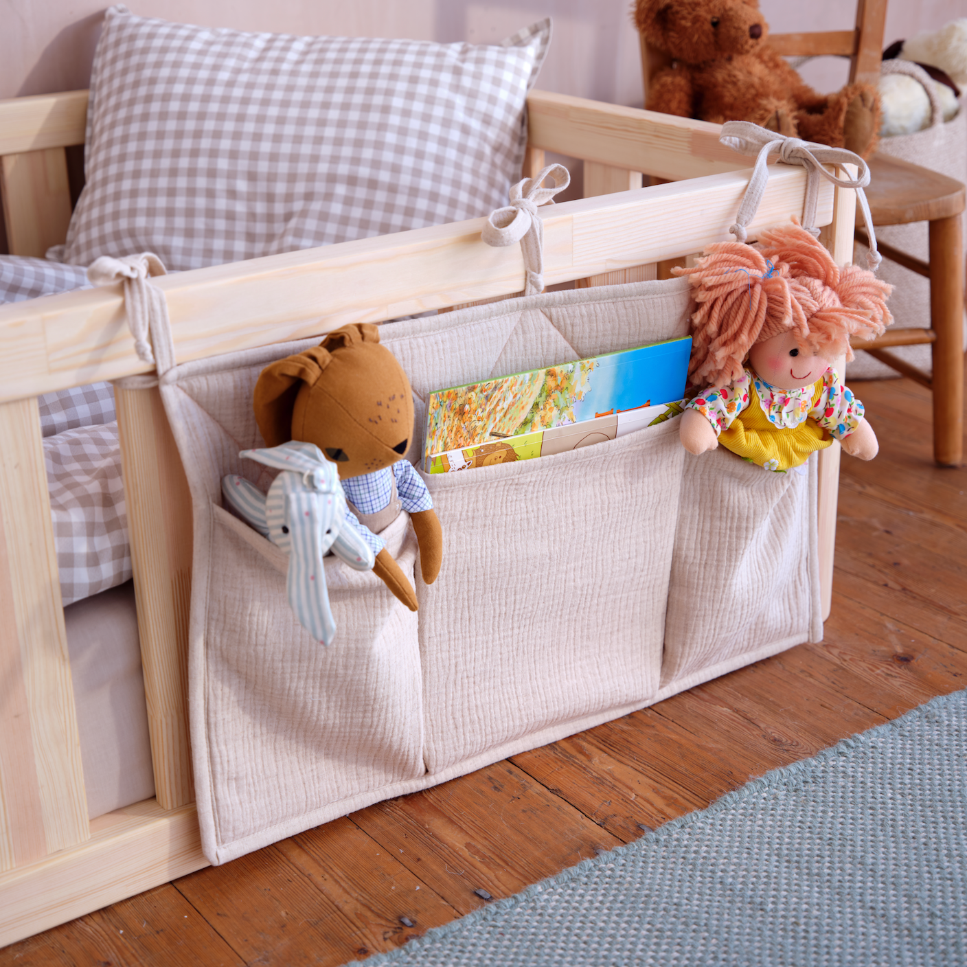 Quality muslin bed organiser to store books and toys. Specifically made to fit our toddler beds and hang neatly over the side. Perfect for little hands to grab their favourite things and self-settle at bedtime.
