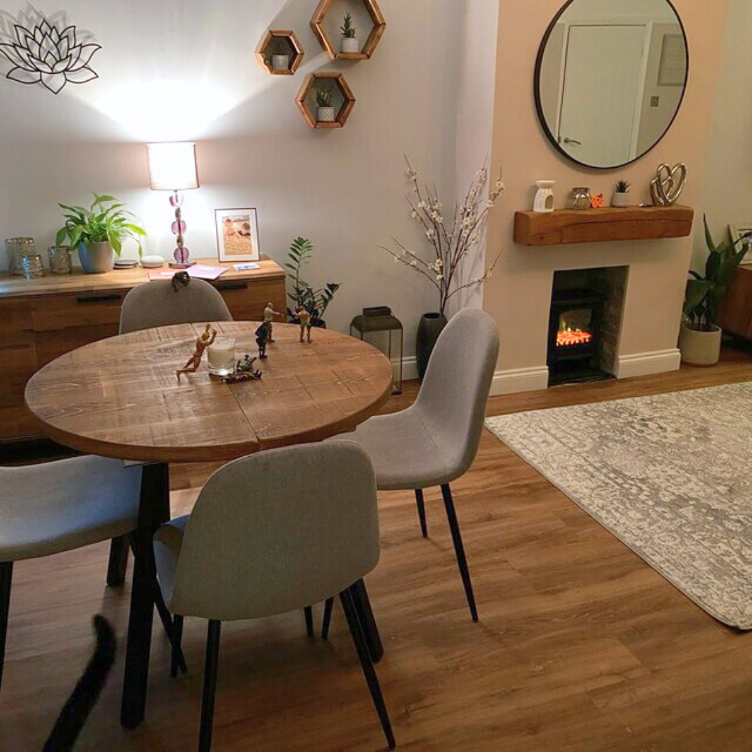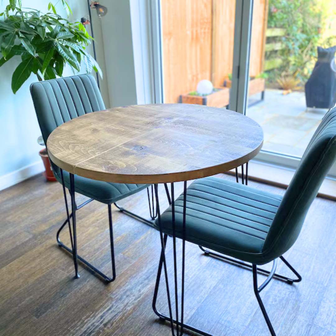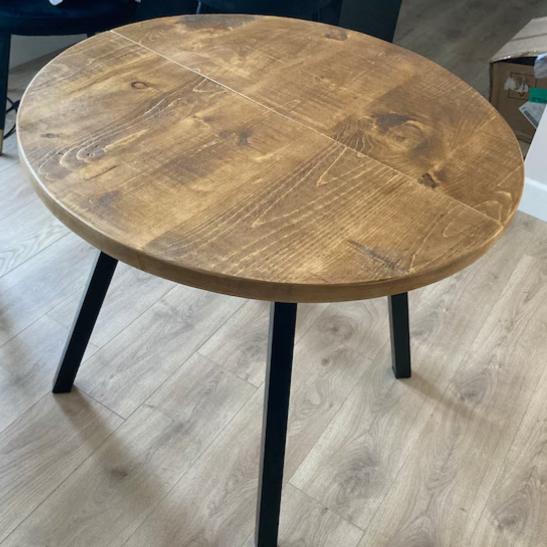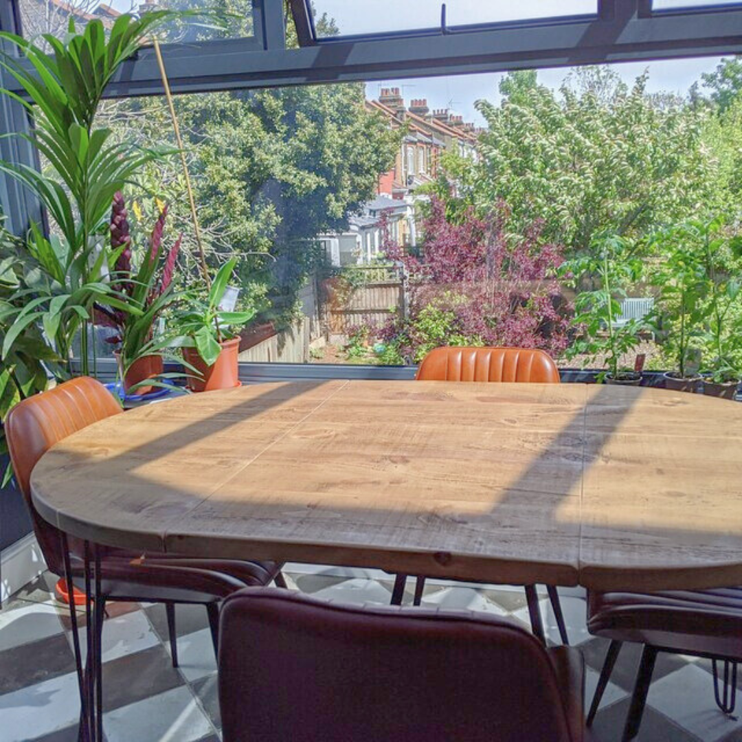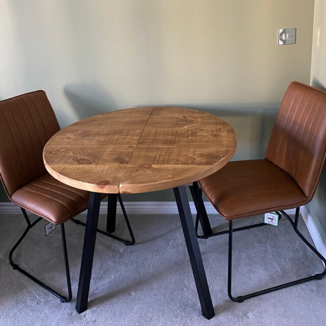 Custom-sized round extendable dining table with a choice of steel legs. A flexible solution for small spaces that can extend an additional 60cm when needed.