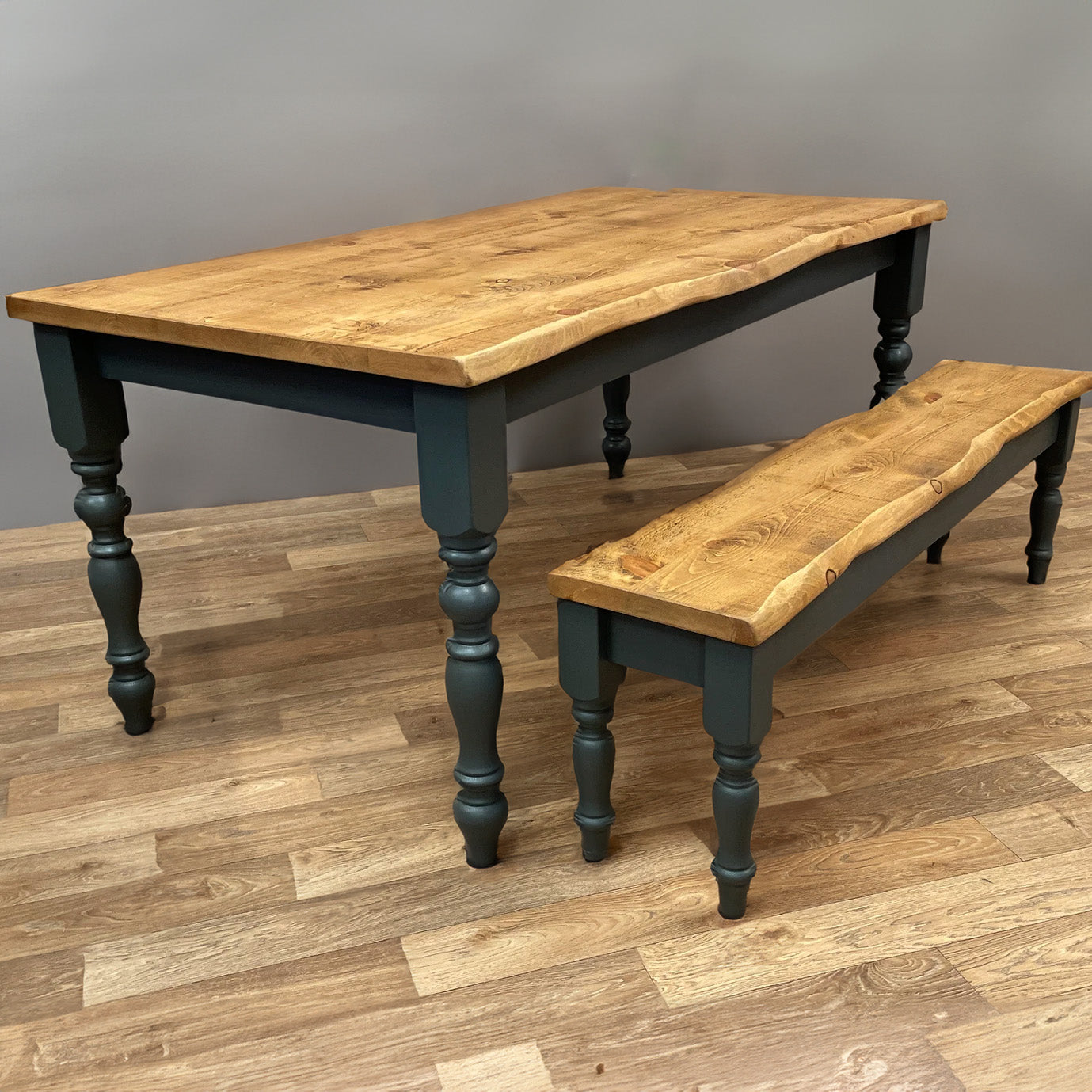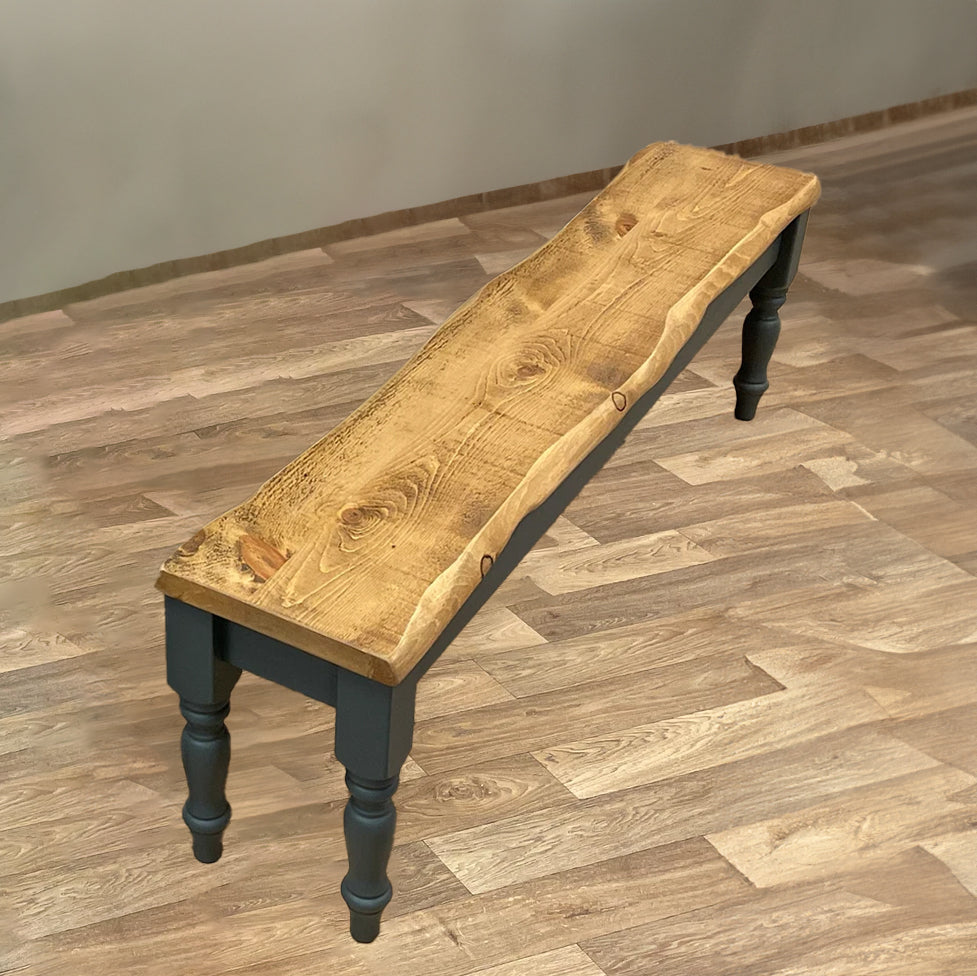 Farmhouse style seating bench with a choice of painted legs to match your farmhouse dining table or just by itself. All benches are custom made to your desired size with either a natural or straight edge. Benches need to be 20cm shorter in length than any dining table.