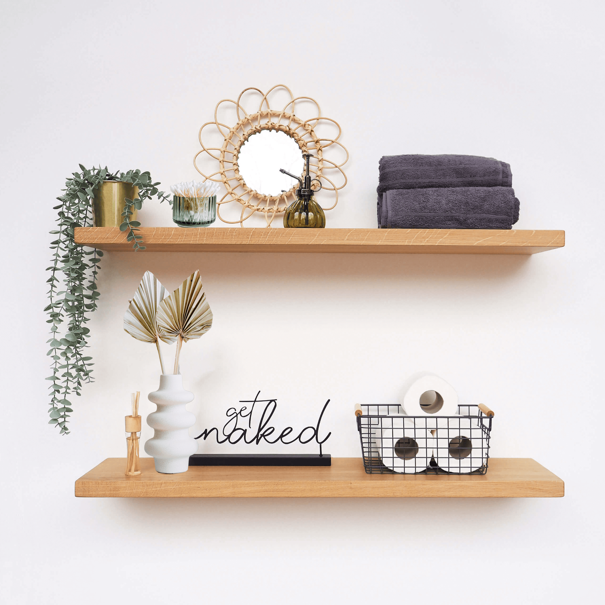 Cut-to-size solid wood floating shelves. Everything you need to complete the project yourself including the right fixings, tools and step by step instructions. Please note for sturdiness we do not recommend depths above 22cm.